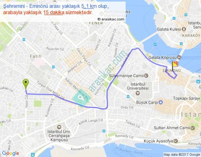 Şehremini - Eminönü arası yaklaşık olarak 90 km/h ile yukarıda belirtilen sürede olup, iki yerin kuş uçuşu uzaklığı (mesafesi) 3'dir. Yolculuk otobüsle 19 dakika sürmektedir.