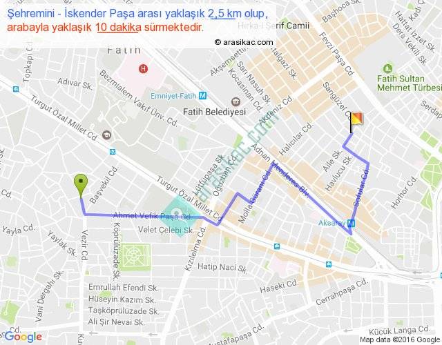 Şehremini - İskender Paşa arası yaklaşık olarak 90 km/h ile yukarıda belirtilen sürede olup, iki yerin kuş uçuşu uzaklığı (mesafesi) 1'dir. Yolculuk otobüsle 13 dakika sürmektedir.