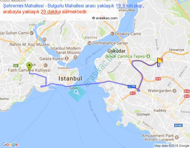 Şehremini Mahallesi - Bulgurlu Mahallesi arası yaklaşık olarak 90 km/h ile yukarıda belirtilen sürede olup, iki yerin kuş uçuşu uzaklığı (mesafesi) 12'dir. Yolculuk otobüsle 37 dakika sürmektedir.