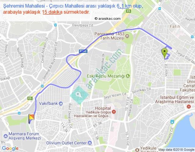 Şehremini Mahallesi - Çırpıcı Mahallesi arası yaklaşık olarak 90 km/h ile yukarıda belirtilen sürede olup, iki yerin kuş uçuşu uzaklığı (mesafesi) 4'dir. Yolculuk otobüsle 19 dakika sürmektedir.