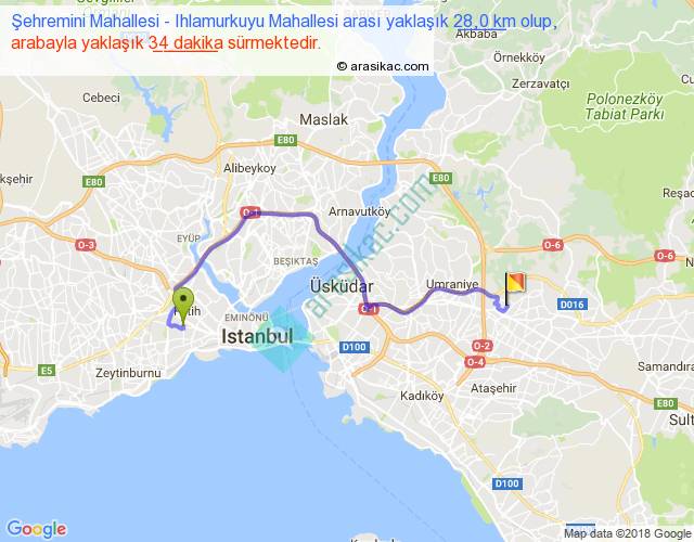 Şehremini Mahallesi - Ihlamurkuyu Mahallesi arası yaklaşık olarak 90 km/h ile yukarıda belirtilen sürede olup, iki yerin kuş uçuşu uzaklığı (mesafesi) 17'dir. Yolculuk otobüsle 44 dakika sürmektedir.