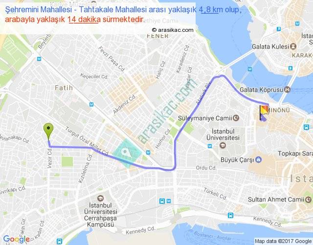 Şehremini Mahallesi - Tahtakale Mahallesi arası yaklaşık olarak 90 km/h ile yukarıda belirtilen sürede olup, iki yerin kuş uçuşu uzaklığı (mesafesi) 3'dir. Yolculuk otobüsle 18 dakika sürmektedir.