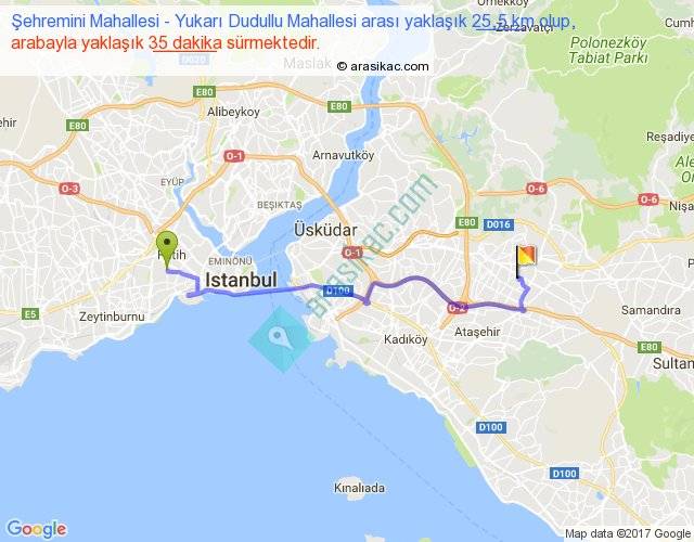 Şehremini Mahallesi - Yukarı Dudullu Mahallesi arası yaklaşık olarak 90 km/h ile yukarıda belirtilen sürede olup, iki yerin kuş uçuşu uzaklığı (mesafesi) 19'dir. Yolculuk otobüsle 45 dakika sürmektedir.