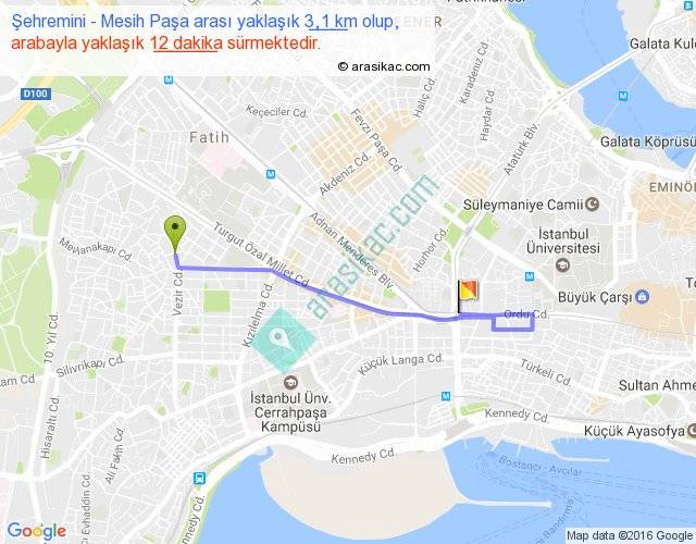 Şehremini - Mesih Paşa arası yaklaşık olarak 90 km/h ile yukarıda belirtilen sürede olup, iki yerin kuş uçuşu uzaklığı (mesafesi) 2'dir. Yolculuk otobüsle 15 dakika sürmektedir.