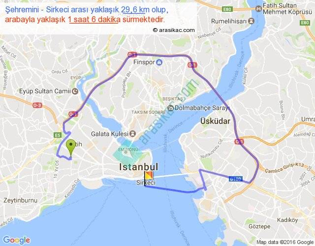 Şehremini - Sirkeci arası yaklaşık olarak 90 km/h ile yukarıda belirtilen sürede olup, iki yerin kuş uçuşu uzaklığı (mesafesi) 5'dir. Yolculuk otobüsle 1 saat 25 dakika sürmektedir.