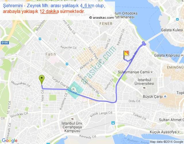 Şehremini - Zeyrek Mh. arası yaklaşık olarak 90 km/h ile yukarıda belirtilen sürede olup, iki yerin kuş uçuşu uzaklığı (mesafesi) 2'dir. Yolculuk otobüsle 15 dakika sürmektedir.
