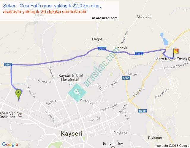 Şeker - Gesi Fatih arası yaklaşık olarak 90 km/h ile yukarıda belirtilen sürede olup, iki yerin kuş uçuşu uzaklığı (mesafesi) 16'dir. Yolculuk otobüsle 26 dakika sürmektedir.