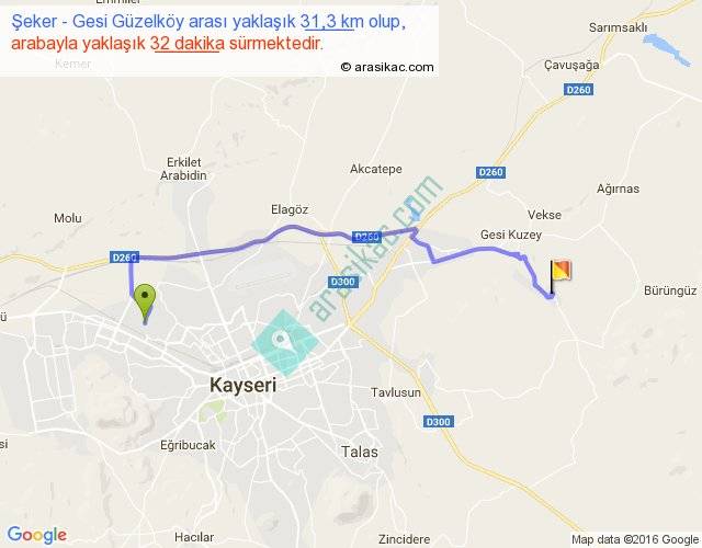 Şeker - Gesi Güzelköy arası yaklaşık olarak 90 km/h ile yukarıda belirtilen sürede olup, iki yerin kuş uçuşu uzaklığı (mesafesi) 22'dir. Yolculuk otobüsle 41 dakika sürmektedir.