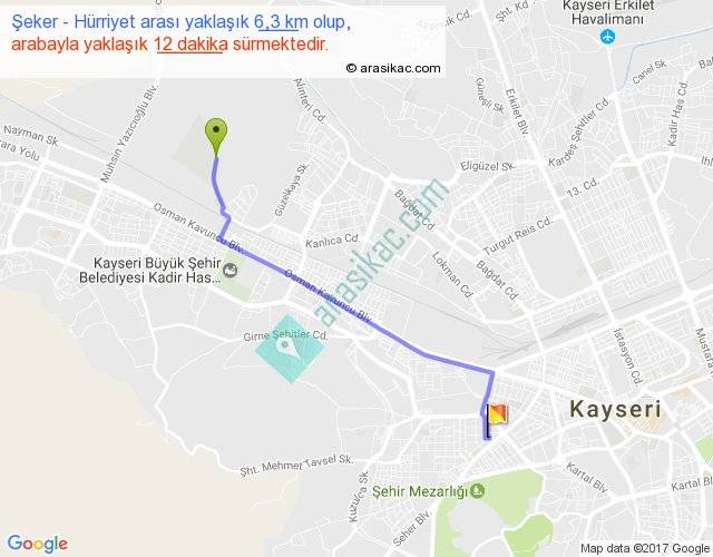 Şeker - Hürriyet arası yaklaşık olarak 90 km/h ile yukarıda belirtilen sürede olup, iki yerin kuş uçuşu uzaklığı (mesafesi) 5'dir. Yolculuk otobüsle 15 dakika sürmektedir.