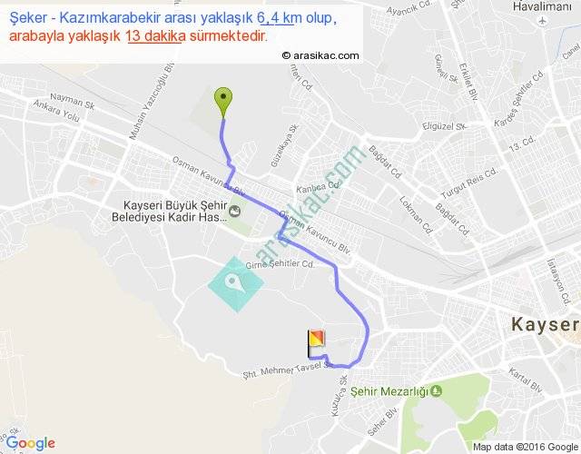 Şeker - Kazımkarabekir arası yaklaşık olarak 90 km/h ile yukarıda belirtilen sürede olup, iki yerin kuş uçuşu uzaklığı (mesafesi) 4'dir. Yolculuk otobüsle 16 dakika sürmektedir.