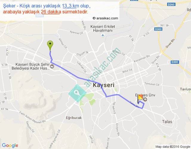 Şeker - Köşk arası yaklaşık olarak 90 km/h ile yukarıda belirtilen sürede olup, iki yerin kuş uçuşu uzaklığı (mesafesi) 10'dir. Yolculuk otobüsle 33 dakika sürmektedir.