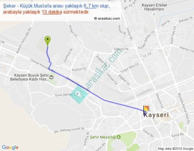 Şeker - Küçük Mustafa arası yaklaşık olarak 90 km/h ile yukarıda belirtilen sürede olup, iki yerin kuş uçuşu uzaklığı (mesafesi) 6'dir. Yolculuk otobüsle 16 dakika sürmektedir.