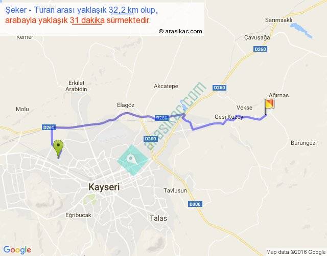 Şeker - Turan arası yaklaşık olarak 90 km/h ile yukarıda belirtilen sürede olup, iki yerin kuş uçuşu uzaklığı (mesafesi) 25'dir. Yolculuk otobüsle 40 dakika sürmektedir.
