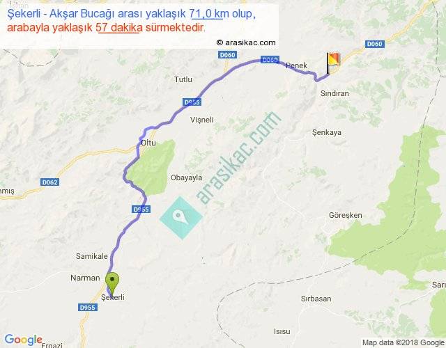 Şekerli - Akşar Bucağı arası yaklaşık olarak 90 km/h ile yukarıda belirtilen sürede olup, iki yerin kuş uçuşu uzaklığı (mesafesi) 51'dir. Yolculuk otobüsle 1 saat 14 dakika sürmektedir.