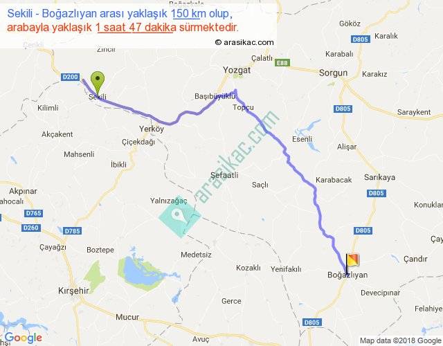 Sekili - Boğazlıyan arası yaklaşık olarak 90 km/h ile yukarıda belirtilen sürede olup, iki yerin kuş uçuşu uzaklığı (mesafesi) 104'dir. Yolculuk otobüsle 2 saat 19 dakika sürmektedir.