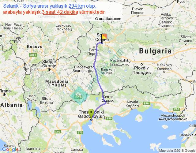 Selanik - Sofya arası yaklaşık olarak 90 km/h ile yukarıda belirtilen sürede olup, iki yerin kuş uçuşu uzaklığı (mesafesi) 230'dir. Yolculuk otobüsle 4 saat 48 dakika sürmektedir.