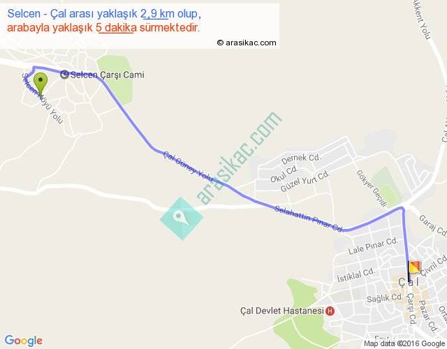 Selcen - Çal arası yaklaşık olarak 90 km/h ile yukarıda belirtilen sürede olup, iki yerin kuş uçuşu uzaklığı (mesafesi) 2'dir. Yolculuk otobüsle 6 dakika sürmektedir.