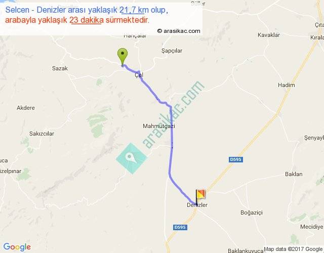 Selcen - Denizler arası yaklaşık olarak 90 km/h ile yukarıda belirtilen sürede olup, iki yerin kuş uçuşu uzaklığı (mesafesi) 19'dir. Yolculuk otobüsle 29 dakika sürmektedir.