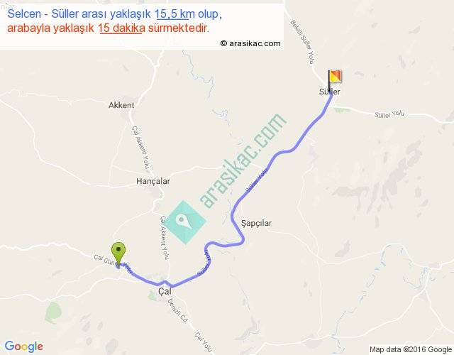 Selcen - Süller arası yaklaşık olarak 90 km/h ile yukarıda belirtilen sürede olup, iki yerin kuş uçuşu uzaklığı (mesafesi) 12'dir. Yolculuk otobüsle 19 dakika sürmektedir.