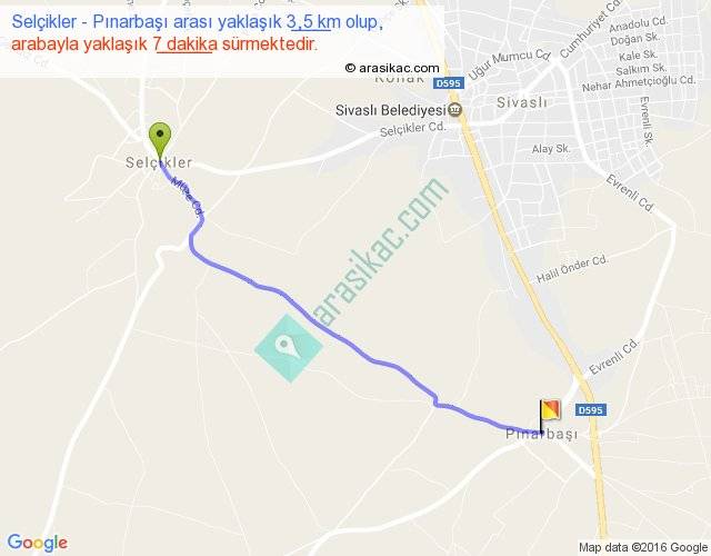 Selçikler - Pınarbaşı arası yaklaşık olarak 90 km/h ile yukarıda belirtilen sürede olup, iki yerin kuş uçuşu uzaklığı (mesafesi) 3'dir. Yolculuk otobüsle 9 dakika sürmektedir.