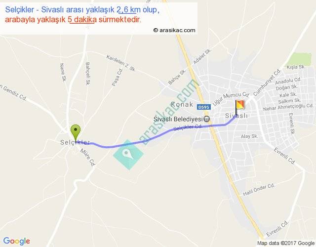 Selçikler - Sivaslı arası yaklaşık olarak 90 km/h ile yukarıda belirtilen sürede olup, iki yerin kuş uçuşu uzaklığı (mesafesi) 2'dir. Yolculuk otobüsle 6 dakika sürmektedir.