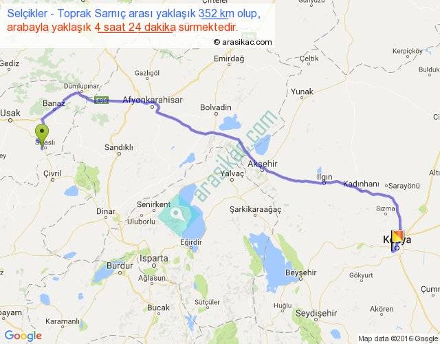 Selçikler - Toprak Sarnıç arası yaklaşık olarak 90 km/h ile yukarıda belirtilen sürede olup, iki yerin kuş uçuşu uzaklığı (mesafesi) 254'dir. Eğer belirtilen yerler arasında uçak seferi var ise bu süre uçakla 23 dakika'ya kadar düşebilir. Yolculuk otobüsle 5 saat 43 dakika sürmektedir.