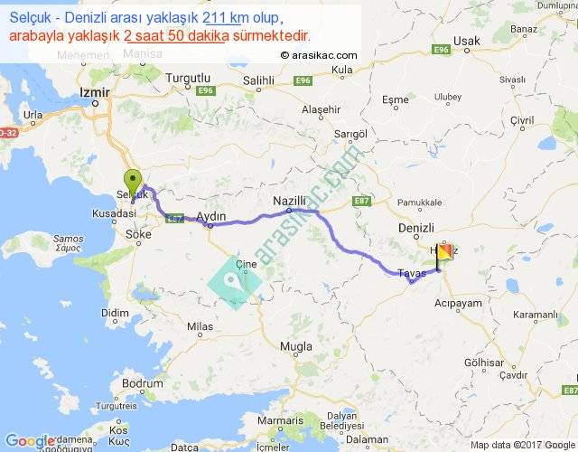 Selçuk - Denizli arası yaklaşık olarak 90 km/h ile yukarıda belirtilen sürede olup, iki yerin kuş uçuşu uzaklığı (mesafesi) 167'dir. Yolculuk otobüsle 3 saat 41 dakika sürmektedir.