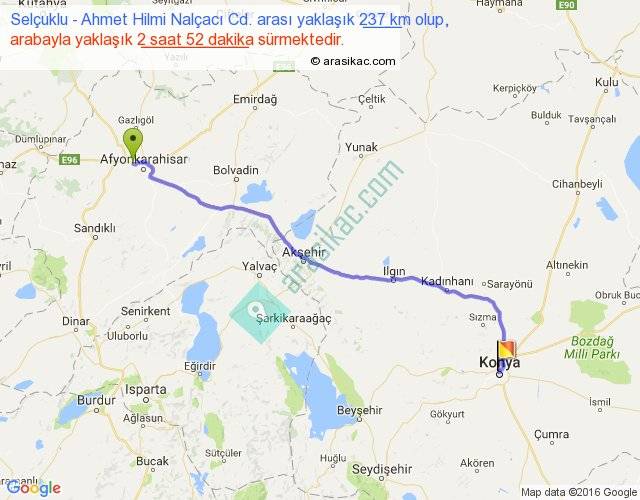 Selçuklu - Ahmet Hilmi Nalçacı Cd. arası yaklaşık olarak 90 km/h ile yukarıda belirtilen sürede olup, iki yerin kuş uçuşu uzaklığı (mesafesi) 201'dir. Yolculuk otobüsle 3 saat 43 dakika sürmektedir.