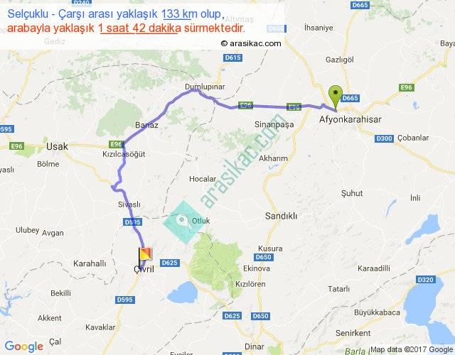 Selçuklu - Çarşı arası yaklaşık olarak 90 km/h ile yukarıda belirtilen sürede olup, iki yerin kuş uçuşu uzaklığı (mesafesi) 84'dir. Yolculuk otobüsle 2 saat 12 dakika sürmektedir.