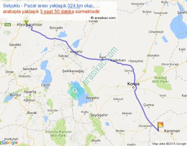 Selçuklu - Pazar arası yaklaşık olarak 90 km/h ile yukarıda belirtilen sürede olup, iki yerin kuş uçuşu uzaklığı (mesafesi) 277'dir. Eğer belirtilen yerler arasında uçak seferi var ise bu süre uçakla 25 dakika'ya kadar düşebilir. Yolculuk otobüsle 4 saat 59 dakika sürmektedir.