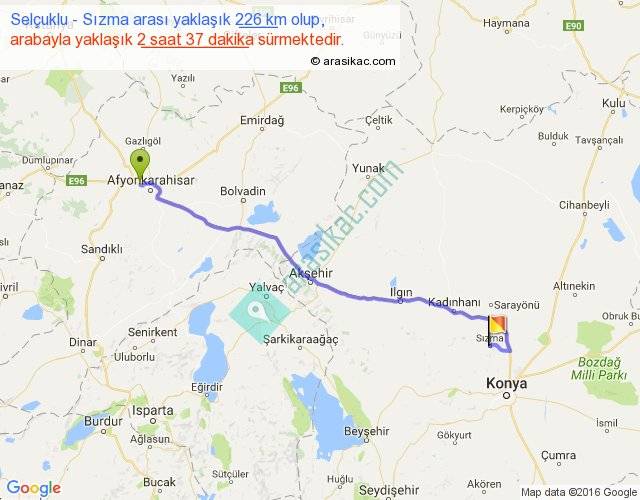 Selçuklu - Sızma arası yaklaşık olarak 90 km/h ile yukarıda belirtilen sürede olup, iki yerin kuş uçuşu uzaklığı (mesafesi) 183'dir. Yolculuk otobüsle 3 saat 24 dakika sürmektedir.