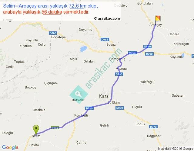 Selim - Arpaçay arası yaklaşık olarak 90 km/h ile yukarıda belirtilen sürede olup, iki yerin kuş uçuşu uzaklığı (mesafesi) 62'dir. Yolculuk otobüsle 1 saat 12 dakika sürmektedir.
