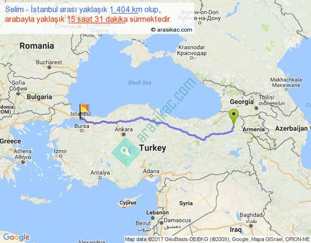 Selim - İstanbul arası yaklaşık olarak 90 km/h ile yukarıda belirtilen sürede olup, iki yerin kuş uçuşu uzaklığı (mesafesi) 1157'dir. Eğer belirtilen yerler arasında uçak seferi var ise bu süre uçakla 1 saat 46 dakika'ya kadar düşebilir. Yolculuk otobüsle 20 saat 10 dakika sürmektedir.