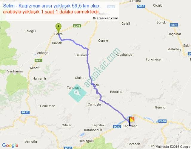 Selim - Kağızman arası yaklaşık olarak 90 km/h ile yukarıda belirtilen sürede olup, iki yerin kuş uçuşu uzaklığı (mesafesi) 45'dir. Yolculuk otobüsle 1 saat 19 dakika sürmektedir.