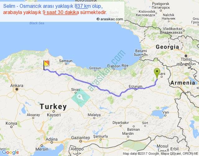 Selim - Osmancık arası yaklaşık olarak 90 km/h ile yukarıda belirtilen sürede olup, iki yerin kuş uçuşu uzaklığı (mesafesi) 672'dir. Eğer belirtilen yerler arasında uçak seferi var ise bu süre uçakla 1 saat 02 dakika'ya kadar düşebilir. Yolculuk otobüsle 12 saat 21 dakika sürmektedir.