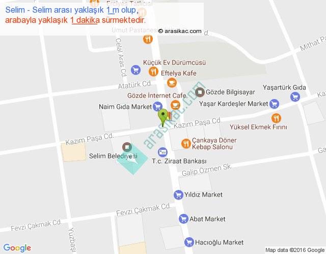 Selim - Selim arası yaklaşık olarak 90 km/h ile yukarıda belirtilen sürede olup, iki yerin kuş uçuşu uzaklığı (mesafesi) 0'dir. Yolculuk otobüsle 1 dakika sürmektedir.