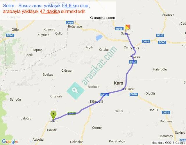 Selim - Susuz arası yaklaşık olarak 90 km/h ile yukarıda belirtilen sürede olup, iki yerin kuş uçuşu uzaklığı (mesafesi) 45'dir. Yolculuk otobüsle 1 saat 1 dakika sürmektedir.