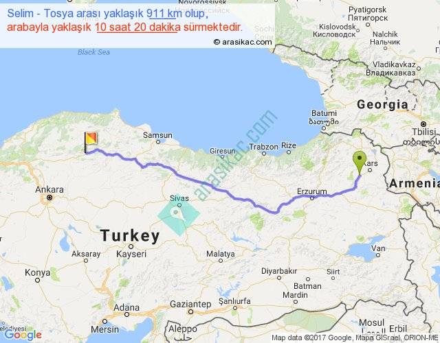Selim - Tosya arası yaklaşık olarak 90 km/h ile yukarıda belirtilen sürede olup, iki yerin kuş uçuşu uzaklığı (mesafesi) 735'dir. Eğer belirtilen yerler arasında uçak seferi var ise bu süre uçakla 1 saat 07 dakika'ya kadar düşebilir. Yolculuk otobüsle 13 saat 26 dakika sürmektedir.