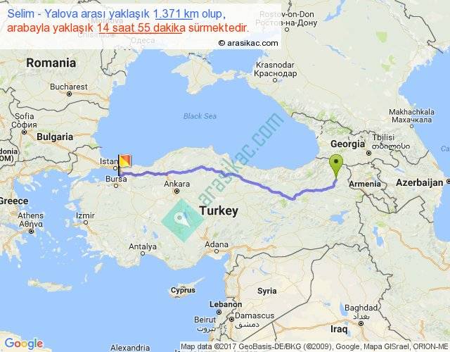 Selim - Yalova arası yaklaşık olarak 90 km/h ile yukarıda belirtilen sürede olup, iki yerin kuş uçuşu uzaklığı (mesafesi) 1133'dir. Eğer belirtilen yerler arasında uçak seferi var ise bu süre uçakla 1 saat 44 dakika'ya kadar düşebilir. Yolculuk otobüsle 19 saat 23 dakika sürmektedir.