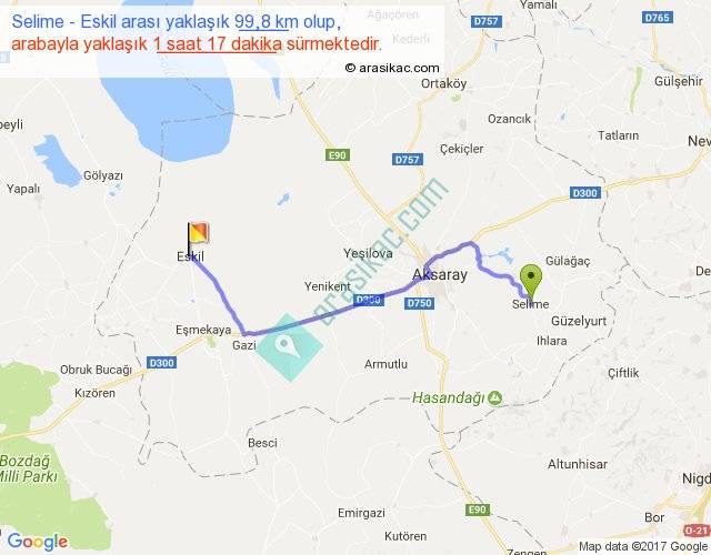 Selime - Eskil arası yaklaşık olarak 90 km/h ile yukarıda belirtilen sürede olup, iki yerin kuş uçuşu uzaklığı (mesafesi) 74'dir. Yolculuk otobüsle 1 saat 40 dakika sürmektedir.