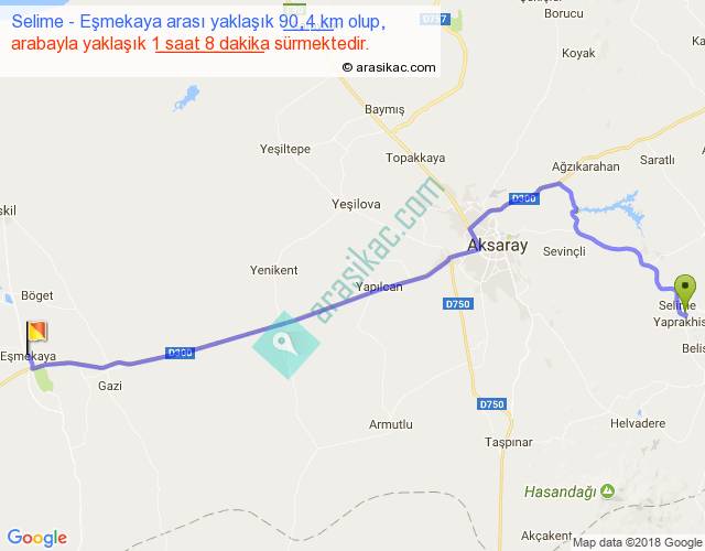 Selime - Eşmekaya arası yaklaşık olarak 90 km/h ile yukarıda belirtilen sürede olup, iki yerin kuş uçuşu uzaklığı (mesafesi) 71'dir. Yolculuk otobüsle 1 saat 28 dakika sürmektedir.