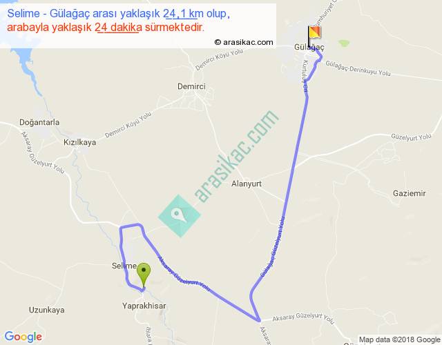 Selime - Gülağaç arası yaklaşık olarak 90 km/h ile yukarıda belirtilen sürede olup, iki yerin kuş uçuşu uzaklığı (mesafesi) 13'dir. Yolculuk otobüsle 31 dakika sürmektedir.