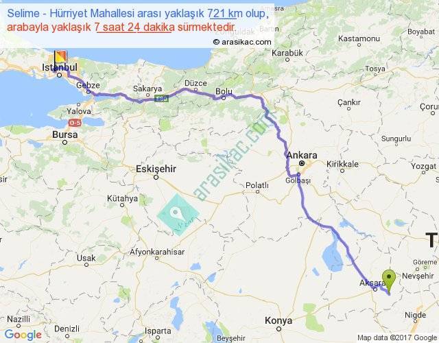 Selime - Hürriyet Mahallesi arası yaklaşık olarak 90 km/h ile yukarıda belirtilen sürede olup, iki yerin kuş uçuşu uzaklığı (mesafesi) 546'dir. Eğer belirtilen yerler arasında uçak seferi var ise bu süre uçakla 50 dakika'ya kadar düşebilir. Yolculuk otobüsle 9 saat 37 dakika sürmektedir.