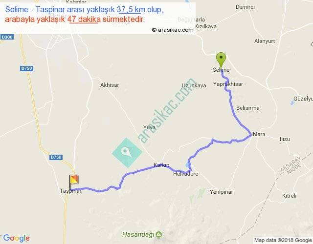 Selime - Taspinar arası yaklaşık olarak 90 km/h ile yukarıda belirtilen sürede olup, iki yerin kuş uçuşu uzaklığı (mesafesi) 23'dir. Yolculuk otobüsle 1 saat 1 dakika sürmektedir.