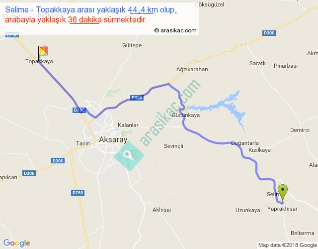Selime - Topakkaya arası yaklaşık olarak 90 km/h ile yukarıda belirtilen sürede olup, iki yerin kuş uçuşu uzaklığı (mesafesi) 34'dir. Yolculuk otobüsle 46 dakika sürmektedir.