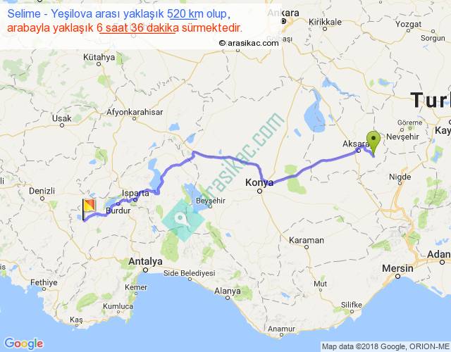 Selime - Yeşilova arası yaklaşık olarak 90 km/h ile yukarıda belirtilen sürede olup, iki yerin kuş uçuşu uzaklığı (mesafesi) 403'dir. Eğer belirtilen yerler arasında uçak seferi var ise bu süre uçakla 37 dakika'ya kadar düşebilir. Yolculuk otobüsle 8 saat 34 dakika sürmektedir.