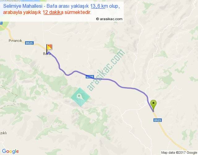 Selimiye Mahallesi - Bafa arası yaklaşık olarak 90 km/h ile yukarıda belirtilen sürede olup, iki yerin kuş uçuşu uzaklığı (mesafesi) 12'dir. Yolculuk otobüsle 15 dakika sürmektedir.
