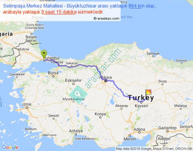 Selimpaşa Merkez Mahallesi - Büyüktuzhisar arası yaklaşık olarak 90 km/h ile yukarıda belirtilen sürede olup, iki yerin kuş uçuşu uzaklığı (mesafesi) 673'dir. Eğer belirtilen yerler arasında uçak seferi var ise bu süre uçakla 1 saat 02 dakika'ya kadar düşebilir. Yolculuk otobüsle 12 saat 1 dakika sürmektedir.