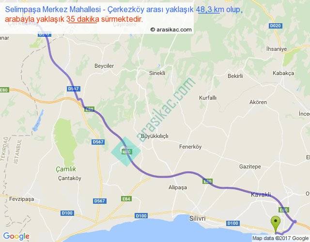 Selimpaşa Merkez Mahallesi - Çerkezköy arası yaklaşık olarak 90 km/h ile yukarıda belirtilen sürede olup, iki yerin kuş uçuşu uzaklığı (mesafesi) 39'dir. Yolculuk otobüsle 45 dakika sürmektedir.