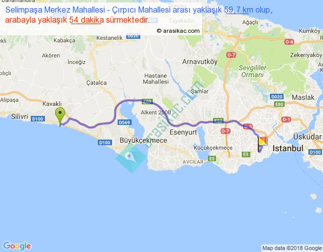 Selimpaşa Merkez Mahallesi - Çırpıcı Mahallesi arası yaklaşık olarak 90 km/h ile yukarıda belirtilen sürede olup, iki yerin kuş uçuşu uzaklığı (mesafesi) 46'dir. Yolculuk otobüsle 1 saat 10 dakika sürmektedir.